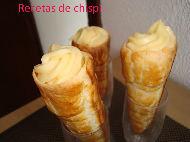 Poner la crema ya fria en la manga pastelera y rellenar los canutillos, espolvorear con azúcar glas.